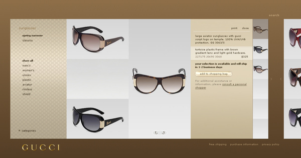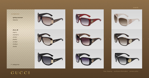在這乾淨俐落的外表下,Gucci還為使用者考慮更多,選擇AJAX與JAVA,省去使用者下載flash外掛程式的麻煩,運用不同思考與技術,創造乾淨好用的使用介面,Gucci提供了不同的虛擬名店經驗,歡迎消費者隨時光臨。