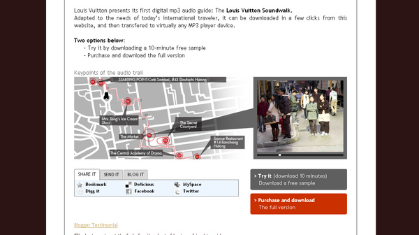 Louis Vuitton Soundwork利用動人的影像、音樂與口述,並提供地圖、下載MP3讓使用者體驗更多。(louisvuittonsoundwalk.com)