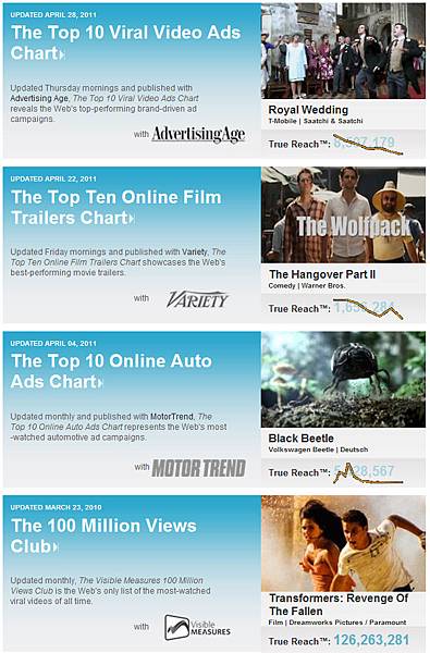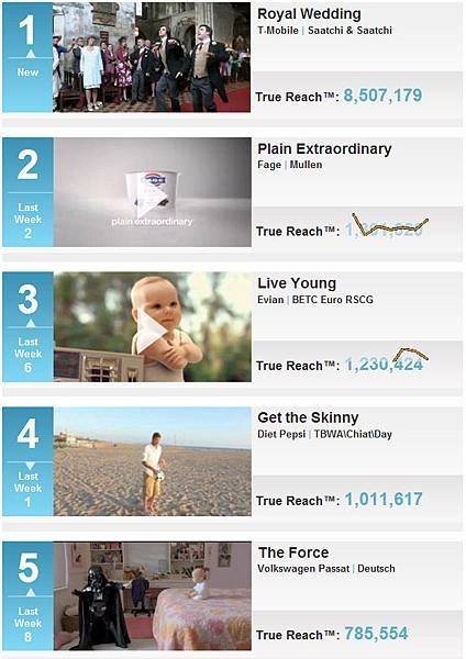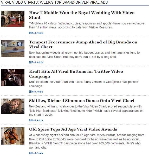 網路使用時間不斷往上提升,讓大家紛紛思考廣告如何在網路上產生影響力,規劃網路使用者喜歡、想看、傳遞的網路廣告短片,許多幽默、異狀、衝突、模仿、性感...的Viral Video紛紛出現,有些更利用互動溝通、連續報導、現場實境...等方式,與使用者互動,創造更佳的Earned Media效應,許多影片都衝上了百萬瀏覽,在Visible Measures 與 AdvertingAge 網站,每週均公佈Viral Video Charts,受熱烈討論的Evian: Live Young、Orabursh the Movie、Old Spice Man is Back 都在熱門排行中!